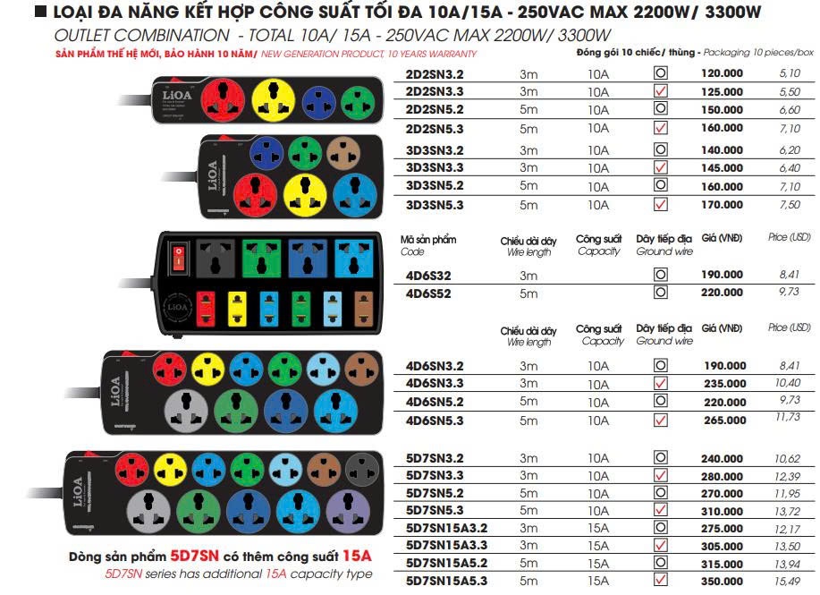 Số ổ cắm: 10 ổ trong đố có 4 ổ đăng và 6 ổ thường 2 chân 2 chấu